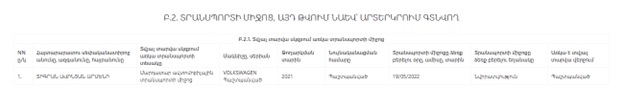 Մեքենան՝ 2021 թվականի արտադրության Volkswagen-ը, նույնպես սեփականություն է դարձել 2022 թվականին կատարված նվիրատվության արդյունքում։ Այսինքն՝ ակտիվների զգալի մասը ձևավորվում է ոչ թե դասական շուկայական մեխանիզմների, այլ անհատույց փոխանցումների միջոցով, ինչն ինքնին առանձնահատուկ ուշադրության է արժանի։